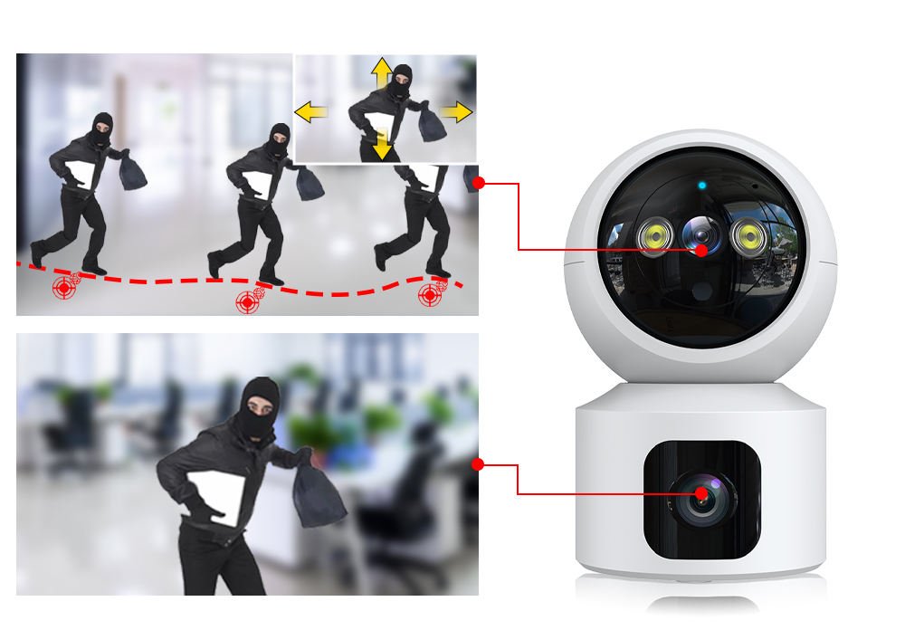 The Tuya Indoor PTZ Camera is a versatile and advanced security solution designed to provide comprehensive surveillance for your home or office. This camera features a unique dual-lens system, combining a 2MP fixed lens and a 2MP PTZ (Pan-Tilt-Zoom) lens in one unit, offering unparalleled coverage and flexibility.